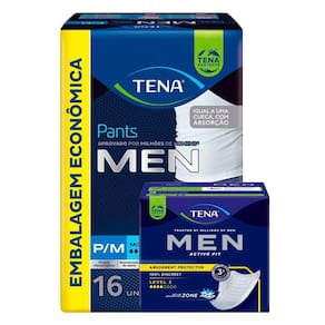 Kit contém:Absorvente Protetor Masculino Tena Men Active Fit 10 Unidades +Cueca Descartável Tena Pants Men P/M 16 Unidades