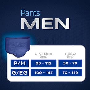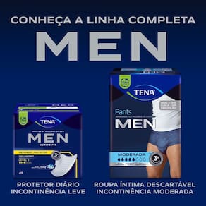 TENA Pants MEN é uma roupa íntima descartável que veste como cueca, desenvolvida especialmente para homens com incontinência urinária moderada que buscam conforto, discrição, segurança contra vazamentos e manter o cuidado com a pele. Possui neutralizador de odor e uma zona de absorção segura, formato anatômico que se ajusta perfeitamente ao corpo proporcionando conforto, facilidade de uso e discrição. A segurança deve-se especialmente à uma zona de absorção frontal que absorve rapidamente a urina, mantendo-a longe da pele e assim, deixando-a seca, auxiliando a reduzir o risco de irritações ou infecções cutâneas. TENA Pants MEN é ideal para homens ativos, discreto como uma cueca, com controle de odor e alta absorção.