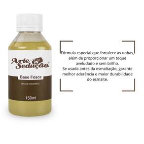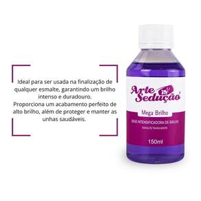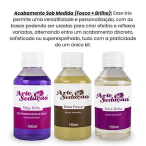 Contém: 01 - Esmalte de Tratamento Base Fosca, 150ml, Arte Sedução; 01 - Base Intensificadora de Brilho Mega Brilho, 150ml, Arte Sedução; 01 - Esmalte de Tratamento Extra Brilho, 150ml, Arte Sedução.