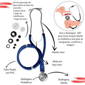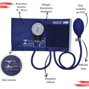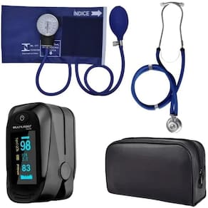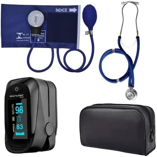 APARELHO DE PRESSÃO PREMIUM + BOLSA DE PROTEÇÃO• Verificado e aprovado pelo INMETRO;• Manguito e pêra em PVC;• Braçadeira em nylon, com fecho de contato.- Garantia da Premium: 1 ano. ESTETOSCÓPIO RAPPAPORT DUPLO PREMIUM (ADULTO E PEDIÁTRICO)• Inclui olivas e diafragmas para conversão em diferentes formas de uso;• Tubo duplo para ausculta mais precisa;• Diafragma de alta sensibilidade;• Acompanha kit de acessórios contendo: 2 pares de oliva, 2 membranas e 3 diafragmas;• Registro Ministério da Saúde / ANVISA.- Garantia da Premium: 1 ano. OXIMETRO DE DEDO• Monitorização da porcentagem de saturação de oxigênio no sangue (spo2) e dos batimentos cardíacos por minuto;• Alta precisão;• Fácil de usar;• Desligamento automático.
