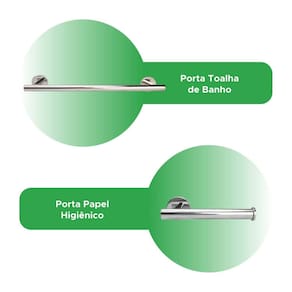 Itens inclusos: - 1x Porta toalha de banho - 1x Porta papel higiênico - 1x Gancho multiúso - 1x Toalheiro de argola - Kit Parafusos e buchas para instalação