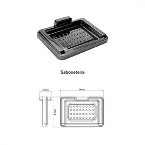 Informações técnicas: Cor: Cinza Fumê Acabamento: Brilhante Composição: Plástico PP e PSAI Fixação: - Saboneteira, papeleira e gancho: adesiva - Porta-shampoo: encaixe Fixação adesiva ideal para superfícies de: Vidro, porcelanatos, granitos, pisos cerâmicos e mármores Dimensões C x A x L : - Porta Shampoo: 30cm x 4,5cm x 10cm - Saboneteira: 14cm x 9,7cm x 3,9cm - Porta Papel Higiênico: 13,7cm x 3,9cm x 8,8cm - Gancho: 3,8cm x 4,5cm x 3,6cm