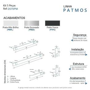 O kit acessórios de banheiro da linha Patmos possui um design atemporal e discreto, são peças de requinte que se destaca com glamour no seu banheiro. Além de decorar, organiza com funcionalidade o banheiro. Criado em metais nobres com uma qualidade que abrange áreas litorâneas e possui a de acabamento alto resistente. Agora é só você adquirir estes lindos acessórios e fazer o seu projeto se tornar realidade com um banheiro prático para toda a sua família. Características Fabricado em metal aço inox. Disponível no Prata Alto Brilho, Escovado e Preto Fosco. Pode ser instalado em parede, azulejo e porcelanato. Benefícios Fixação prática e segura com parafusos e buchas inclusos. O produto não possui nenhum detalhe em plástico ABS . Fácil higienização, ideal para locais que exigem limpeza constante. Aproveitamento inteligente do espaço, ideal para ambientes compactos. Resistente à corrosão e luz solar. Itens ENVIADOS: 2 cabides, 1 porta papel higiênico, 1 toalheiro 35cm, 1 toalheiro 55cm, kit de parafusos e manual instrução instalação. Instalação INTELIGENTE Ao 1º furo, use uma broca medida menor, após use a medida correta e finalize, vai ajudar na precisão da fixação da bucha principalmente em azulejos e porcelanato. Marca: Não Informado Ean: 7908165323435