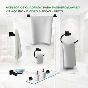 Itens inclusos: - 1x Porta toalha de banho - 1x Porta toalha de rosto - 1x Porta papel higiênico - 1x Gancho multiúso - 1x Saboneteira - 1x Suporte de vidro - Kit Parafusos e buchas para instalação