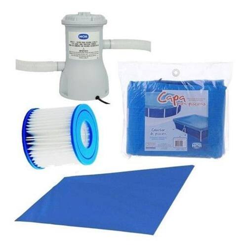 Kit acessórios de piscina capa forro cobertura etc 6200l mor Kit acessórios de piscina capa forro cobertura etc 6200l morcapa para piscina 6200 litros - mor Mantenha sua piscina sempre limpa com a capa piscina premium ela é perfeita para proteger contra insetos parasitas, água da chuva, folhas e sujeiras em geral, conservando a água da piscina própria para banho por muito mais tempo, ajudando assim o meio ambiente. Produzida em polietileno, a capa possui cordas em poliéster para serem fixadas na estrutura da piscina premium de 6.200 litros. Lembrando que, além da capa, é indispensável fazer o tratamento químico recomendado para a capacidade de água da sua piscina de acordo com seu manual Material: polietileno Formato: retangular : 90 dias Dimensões: Comprimento 4,26 m - largura 2,36 m - altura - 0,01 cm Peso: 2,17 kg Forro para piscina 6200 litros Garanta maior durabilidade para sua piscina utilizando o forro piscina premium mor. Ele protege a lona da sua piscina de pequenos objetos pontiagudos como espinhos, pedras e gravetos. Recomendado para piscinas de 6.200 litros, é produzido em polietileno de alta qualidade, assegurando alto nível em resistência, sendo leve e de fácil locomoção. O forro mor faz toda a diferença para a durabilidade da sua piscina, tornando-a mais resistente e perfeita para curtir a estação mais gostosa do ano. Material: polietileno Formato: retangular : 90 dias Dimensões e peso: Largura 1,90 metros - profundidade 3,82 metros - altura 0,01 cm Peso aproximado: 0,474 kg Filtro bomba 3600 litros / hora - 110v ou 220v Em tempo de preocupação ambiental, o uso consciente da água é fundamental. O filtro piscina mor possui capacidade de filtragem de 3.600 litros por hora, o que reduz também o gasto de energia, tornando mais rápido, eficaz e econômico o tratamento da água da sua piscina. Esse filtro é recomendado somente para uso em piscinas desmontáveis e para um bom funcionamento, o seu refil deve ser trocado a cada três meses quando Utilizado constantemente. Acompanha duas mangueiras de 2 metros e é compatível com o refil Material: polipropileno : 90 dias Medida dos componentes do filtro: 01 filtro - 20cm x 18cm x 35cm 02 mangueiras - 3,5cm x 2,00m 04 braçadeiras metálicas - 25mm x 38mm / 1,5cm largura da braçadeira 02 pré filtros - 7cm x 10,5cm 01 refil - 11cm x 19cm Peso: 2,47 kg Itens inclusos Capa para piscina 6200 litros - mor Forro para piscina 6200 litros Filtro bomba 3600 litros / hora - 110v ou 220v