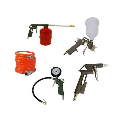 - 1 Pistola para pintura; - 1 Pistola para pulverizar com reservatório; - 1 Pistola de ar para limpeza; - 1 Calibrador de pressão com manômetro; - 1 Mangueira; - 4 Adaptadores de engate rápido.