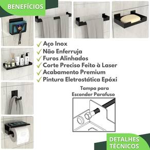 Com um design minimalista, o preferido pelos arquitetos nos últimos tempos, o Kit Acessórios Para Banheiro é fabricado utilizando aço inox com acabamento em Pintura Eletrostática Epóxi Fosca proporcionando maior durabilidade, resistência e garantindo que não ocorrerá oxidação nem ferrugem.