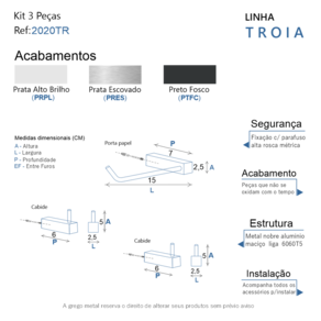 • Fabricado em metal alumínio. • Disponível no Prata Alto Brilho, Escovado e Preto Fosco. • Pode ser instalado em parede, azulejo e porcelanato.