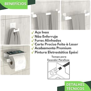 Com um design minimalista, o preferido pelos arquitetos nos últimos tempos, o Kit Acessórios Para Banheiro é fabricado utilizando aço inox com acabamento em Pintura Eletrostática Epóxi proporcionando maior durabilidade, resistência e garantindo que não ocorrerá oxidação nem ferrugem.