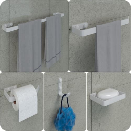 As peças do kit possuem um design clean e sofisticado, suas barras são de alumínio maciço e a grade do porta sabonete é de aço inox, ambos com acabamento em pintura eletrostática epóxi Branca garantindo maior durabilidade e resistência, não havendo problemas com ferrugem.