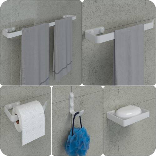As peças do kit possuem um design clean e sofisticado, suas barras são de alumínio maciço e a grade do porta sabonete é de aço inox, ambos com acabamento em pintura eletrostática epóxi branca garantindo maior durabilidade e resistência, não havendo problemas com ferrugem.