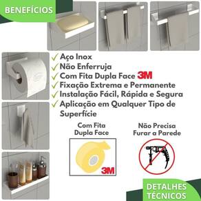 MEDIDAS Porta Toalha de Banho: 5cm x 44cm x 5,5cm Porta Toalha de Rosto: 5cm x 30cm x 5,5cm Porta Papel Higiênico: 9cm x 15cm x 6cm Porta Shampoo: 3,5cm x 25cm x 7,5cm Gancho: 3,5cm x 3cm x 4,5cm Saboneteira: 3,5cm x 12cm x 7,5cm