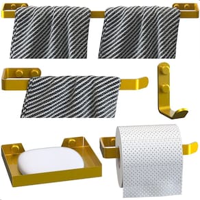Itens INCLUSOS 01 Porta Toalha de Rosto Plus Dourado 01 Porta Toalha de Banho Plus Dourado 01 Porta Papel Higiênico Plus Dourado 01 Gancho Plus Dourado 01 Porta Sabonete Plus Dourado Kit de fixação completo parafusos, buchas e tampas de acabamento
