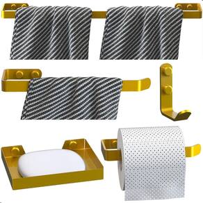 Itens INCLUSOS 01 Porta Toalha de Rosto Plus Dourado 01 Porta Toalha de Banho Plus Dourado 01 Porta Papel Higiênico Plus Dourado 01 Gancho Plus Dourado 01 Porta Sabonete Plus Dourado Kit de fixação completo parafusos, buchas e tampas de acabamento