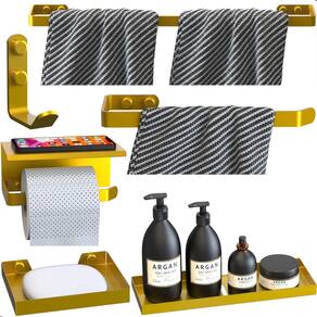 Kit Acessórios Para Banheiro Dourado 6 Peças Max Transforme seu banheiro em um ambiente organizado, moderno e sofisticado com o Kit Acessórios Para Banheiro Dourado 6 Peças Max. Produzido em aço carbono de alta qualidade, com pintura eletrostática epóxi Dourada, este kit une resistência, durabilidade e elegância para o seu dia a dia.