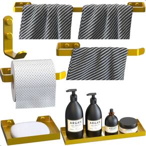 Itens INCLUSOS 01 Porta Toalha de Rosto Plus Dourado 01 Porta Toalha de Banho Plus Dourado 01 Porta Papel Higiênico Plus Dourado 01 Gancho Plus Dourado 01 Porta Shampoo Plus Dourado 01 Porta Sabonete Plus Dourado Kit de fixação completo parafusos, buchas e tampas de acabamento
