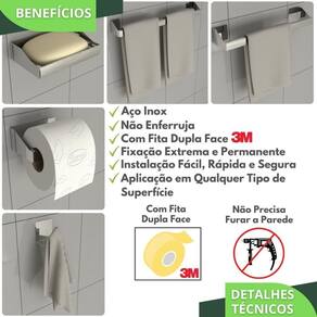Kit Acessórios Para Banheiro Inox 5 Peças Master Slim DF O Kit Acessórios Para Banheiro Dupla Face foi projetado para quem não quer furar a parede e busca por qualidade na fixação e boa aderência em ambientes molhados. Prezando pela sofisticação e elegância, cada traço do produto foi cuidadosamente desenhado para deixar seu banheiro com um visual clean e sofisticado.