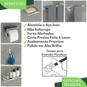 As peças do kit possuem um design clean e sofisticado, suas barras são de alumínio maciço cromadas, o porta shampoo e porta sabonete são de aço inox, ambos com acabamento cromado, garantindo maior durabilidade e resistência, não havendo problemas com ferrugem.
