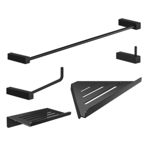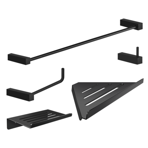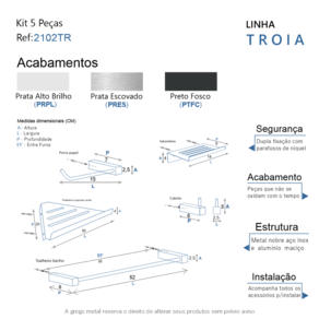 ITENS ENVIADOS: 1 cabide, 1 porta papel higiênico, 1 toalheiro banho 50cm, 1 saboneteira, 1 prateleira suporte canto 30cm, kit de parafusos e manual instrução instalação.