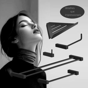 ITENS ENVIADOS: 1 cabide, 1 porta papel higiênico, 1 toalheiro rosto 30cm, 1 toalheiro duplo 60cm, 1 prateleira suporte canto 30cm, kit de parafusos e manual instrução instalação.