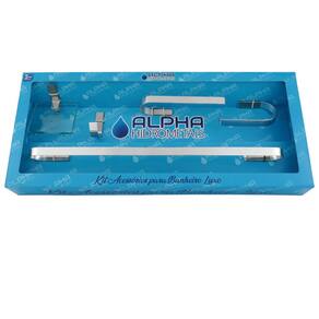 -marca: alpha hidrometais -instalação: parede -utilização: banheiro -modelo: kit de acessórios -material: alumínio alta resistência a riscos e a corrosões -acompanha acessórios para instalação parafusos e buchas -medidas do produto nas imagens