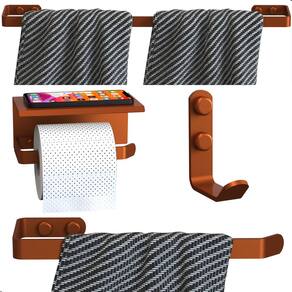 Material Reforçado – Aço carbono de alta resistência, ideal para uso diário Não Enferruja Fácil – Acabamento premium que protege contra umidade e corrosão Design Clean e Sofisticado – Cor Rose Gold para um visual moderno e elegante Instalação Prática – Furos alinhados, parafusos sextavados e tampas de acabamento para um acabamento impecável Funcional – Porta papel higiênico com prateleira superior para apoiar celular, aromatizador ou pequenos itens decorativos