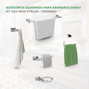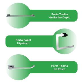 Itens inclusos: - 1x Porta toalha de banho duplo - 1x Cabide - 1x Porta papel higiênico - 1x Gancho multiúso - 1x Saboneteira - Kit Parafusos e buchas para instalação