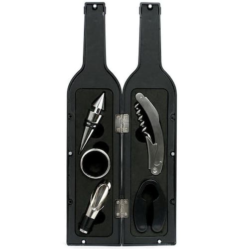 Inclui: - Estojo emborrachado em formato de garrafa - Abridor multifuncional saca rolha em inox - Tampa em inox com dosador - Anel salva gotas em inox - Cortador de lacre