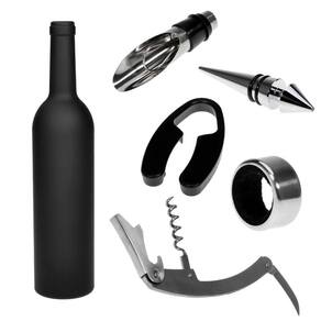 Conjunto de abridor e acessórios para vinho com embalagem em formato de garrafa. Uma ótima opção para você presentear seus clientes, colaboradores, amigos, etc. Para servir os convidados com facilidade e impressionar ao mesmo tempo, este kit possui cinco utensílios essenciais para os amantes do bom vinho.