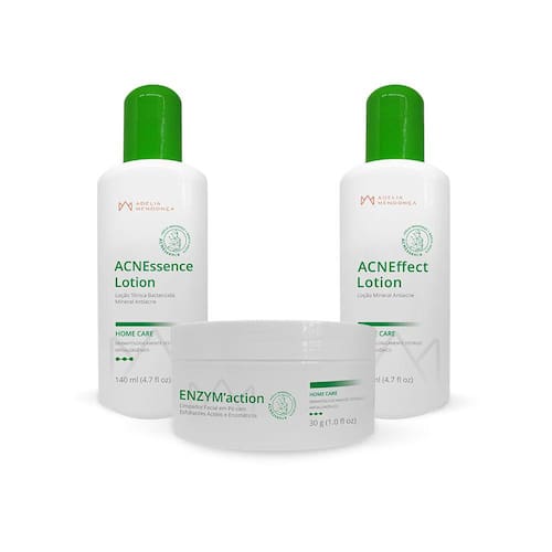 ENZYM`action é um limpador enzimático em pó que desobstrui os poros, remove pontos escuros e promove uma esfoliação suave através da combinação de múltiplas enzimas e ácidos. Sua ação profunda degrada o sebo e a queratina superficiais, enquanto promove um lixamento no interior dos poros, eliminando comedões de forma eficiente. Sua formulação também é rica em oligoelementos e ingredientes dermoativos calmantes, que diminuem os sintomas de irritação cutânea, fortalecem o sistema imunológico e promovem limpeza profunda, intensificando a renovação celular e sua oxigenação. ACNEssence Lotion é uma suspensão tônica com ação secativa e tonalizante para uso em peles seborreicas e acneicas. Apresenta composição inédita e blend de ativos naturais, nano e biotecnológicos, atuando sinergicamente na pele, proporcionando ação sebo reguladora, cicatrizante, anti-inflamatória, calmante, antioxidante e de controle microbiano. ACNEffect Lotion é uma suspensão antiacne de alta eficiência transdérmica. Sua formulação sinergicamente desenvolvida, agregando ativos nano, biotecnológicos e naturais atuam no controle da acne, proporcionando ação secativa, cicatrizante, regeneradora e bactericida, mantendo o controle da microbiota cutânea e profunda atividade antiacne. Marca: Adélia Mendonça Ean: 7898676040320