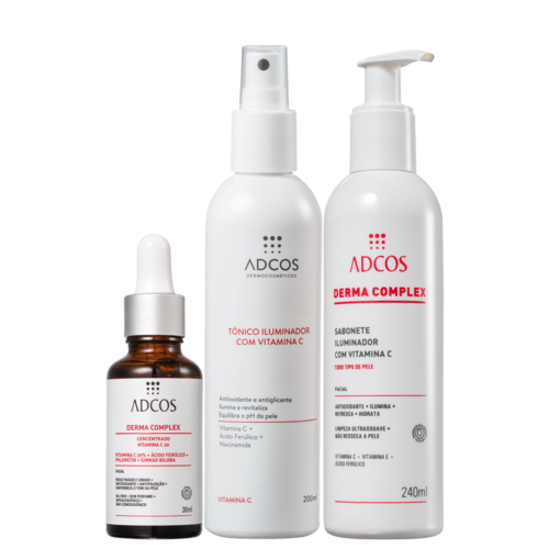 Adcos Derma Complex Vitamina C - Tônico Iluminador Facial 200ml: promove recuperação inteligente da pele desvitalizada e estimula a produção de colágeno através de Flavonóides e Lactonas especiais. Possui ainda 11 Aminoácidos nutritivos, Niacinamida, que hidrata, protege o colágeno (antiglicante) e auxilia no controle da oleosidade.