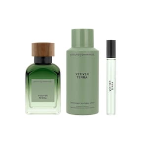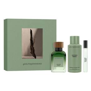 Kit Adolfo Dominguez que contém 1 perfume importado masculino Vetiver Terra EDP 120ml, 1 desodorante corporal 150ml e um perfume de bolso 10ml. Vetiver Terra é um perfume importado masculino robusto e confortável que simboliza a força das raízes da terra e o som envolvente da chuva. A união dos principais elementos da terra em um Eau de Parfum para homens que buscam o reencontro com a natureza. Um perfume amadeirado quente que tem em suas notas de saída o cítrico da bergamota e o toque especial das folhas de figueira que se combinam com o coração amadeirado de vetiver e cedro. Para o conforto, um fundo de caramelo e almíscar. Adolfo Dominguez é uma das principais marcas de moda da Espanha e revolucionou a moda do país ao combinar design de vanguarda com alfaiataria de qualidade e tradições de seus antepassados galegos. OBSERVAÇÕES: Imagem Meramente Ilustrativa ITENS INCLUSOS: 1 Adolfo Dominguez Vetiver Terra Eau de Parfum Perfume Masculino 120 ml;1 Desodorante 150 ml;1 Miniatura 10 ml.