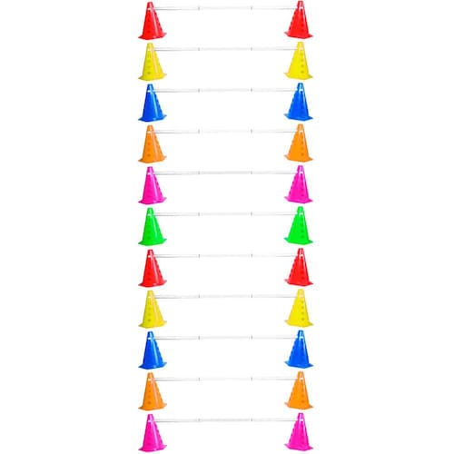Originalmente utilizados em treinamentos de atletas profissionais, jogadores de futebol. Os acessórios da linha de Agilidade se transformaram em febre do treinamento funcional. Excelente ferramenta para treinos de percurso e de agilidade, o Kit de Cones com furos permite a você criar diversos tipos de percursos e tarefas para melhorar sua performance, velocidade, resistência, coordenação e alto gasto calórico. Extremamente leve e portátil. O kit acompanha furos para poder estar colocando barreiras, ou até mesmo sinalizadores. Com os acessórios personalizáveis você pode estar montando barreiras e sinalizadores de vários tamanhos, cada bastão possui 30cm de comprimento, podendo ser encaixado com outros bastões e aumentar o tamanho da barreira ou sinalizador. Características Dimensões do Cone: 16,3 x 14,5 x 22 cm C x L x A Bastão: 30 cm comprimento por barreira, acompanha 3 bastões encaixáveis onde forma 1 barreira de 90cm Itens inclusos: 22 - Cone com furo 11 - Barreira 11 - Kits para encaixe com sinalizador Marca: Natural Fitness