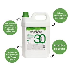 Usada para obter resultados perfeitos com a coloração, a Água Oxigenada é ideal para abrir as escamas do fios, para que o pigmento da coloração ou o pó descolorante penetre com mais eficiência e altere as cores dos fios. De fórmula cremosa, a água Oxigenada contém Lanolina, emoliente especial para processos químicos, que hidrata, fornece brilho, e evita o ressecamento dos cabelos. Se você é um profissional da Beleza, esse item é indispensável para você que busca por um resultado perfeito e uniforme. Pensou em coloração eficiente e preenchida, pensou Beira Alta.