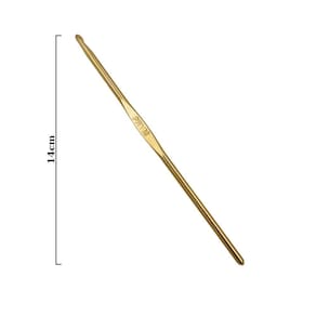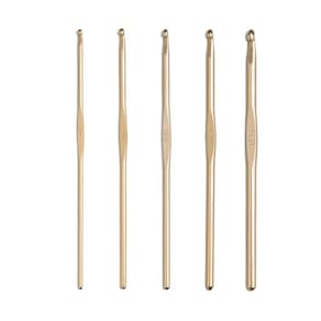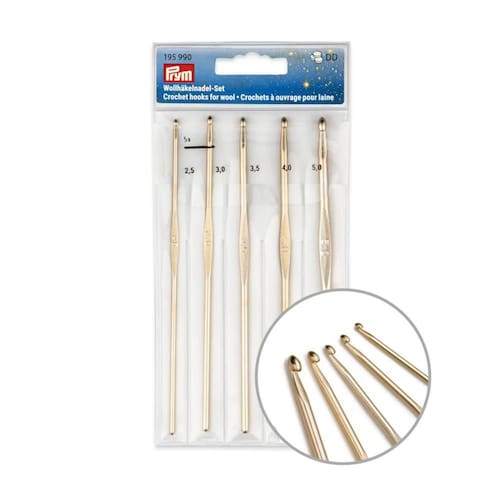 Kit Agulhas para Crochê Prym New Gold com 5 Peças Kit Agulhas para Crochê Prym New Gold com 5 Peças, feitas em alumínio permite que sejam leves e versáteis, além de uma superfície achatada no cabo para facilitar o manuseio. A superfície de guia no eixo garante que o gancho não escorregue em sua mão e permite que você faça crochê com facilidade e precisão. O fundo branco do prático e durável saco de armazenamento de plástico oferece um contraste maravilhoso com as brilhantes agulhas. São 05 tamanhos ideias para todos seus projetos além de serem todas na cor ouro a nova cor da moda