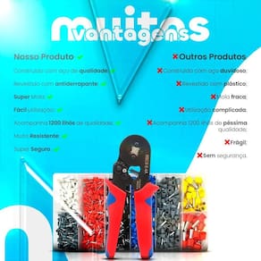 Chega de fios soltos e conexões arriscadas Organize seus projetos elétricos com o kit essencial que garante profissionalismo e segurança. Transforme seus trabalhos com: Precisão : Alicate com catraca para crimpagem perfeita de 0,25 a 10mm. Variedade Total: 1200 terminais ilhós em 8 tamanhos para atender todas as suas necessidades. Organização Impecável: Acompanha caixa organizadora resistente para manter tudo em ordem. Durabilidade Garantida: Alicate em aço especial e terminais de cobre estanhado de alta condutibilidade. Conforto e Segurança: Cabo ergonômico e mecanismo assistido por mola para uso prolongado. Kit Completo Inclui: 1x Alicate de Crimpar Terminais Ilhós 1x Kit com 1200 Terminais Ilhós diversos tamanhos 1x Caixa Organizadora de Terminais Especificações Técnicas do Alicate: - Aplicação: Prensagem de terminais tipo pino tubular. - Bitolas de fios/cabos: 0,25 mm a 10 mm AWG 22 a 10 . - Material: Corpo em aço especial com acabamento fosfatizado. - Cabo: Ergonômico revestido em plástico ABS. - Recursos: Regulador , sistema de catraca com liberação automática, bloqueio de segurança. Especificações Técnicas dos Terminais 1200 unidades : - Material: Tubo de cobre estanhado de alta condutibilidade. - Modelos e Quantidades: - E0508 Branco : 200 un. - E7508 Cinza : 200 un. - E1008 Vermelho : 200 un. - E1508 Preto : 250 un. - E2508 Azul : 250 un. - E4009 Cinza : 50 un. - E6012 Amarelo : 25 un. - E10-12 Vermelho : 25 un. Adquira agora seu kit e eleve a qualidade dos seus projetos elétricos Clique em 'Comprar Agora' e receba no conforto da sua casa.