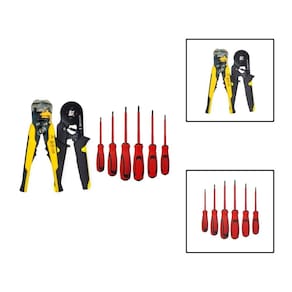 Especificações: - Marca: Bomvink; - Modelos: 1702 e 3110; - Quantidade de Ferramentas: 1 Alicate Crimpador Decapador, 1 Alicate Prensa Terminal e 6 Chaves Isoladas 3 Philips e 3 Fendas ; - Chaves com design ergonômico e cabos antiderrapantes que oferecem maior conforto e firmeza durante o uso; - Cada chave possui isolamento elétrico, garantindo segurança em trabalhos com eletricidade; - Capacidade de Decapagem do Alicate Crimpador e Decapador: Para fios com bitola até 6mm; - Capacidade para Crimpagem do Alicate Crimpador e Decapador: Terminais sem isolamento de 0,5 - 6,0mm / terminais com isolamento de 0,5 - 2.5mm; - O Alicate de Crimpagem possui várias configurações para diferentes bitolas de fios, permitindo uma decapagem sem danos; - O Alicate Prensa Terminais é compatível com terminais de 0,25 a 10mm;