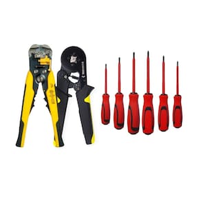 Conteúdo da Embalagem: - 01 Alicate Decapador, Cortador e Crimpador de Fios e Cabos de Até 6mm. - 01 Alicate Prensa Terminal Tubular De 0,35 a 10mm. - 06 Chaves Isoladas, sendo: - 01 Chave de Fenda e 01 Chave Philips na medida 3 x 75 mm. - 01 Chave de Fenda e 01 Chave Philips na medida 4 x 95 mm. - 01 Chave de Fenda e 01 Chave Philips na medida 5 x 100 mm.