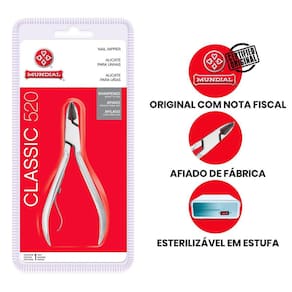 O alicate para unhas classic 520 mundial, é a ferramenta indispensável no processo de corte das unhas, além da estética, o corte tem o objetivo de as deixar limpas e saudáveis, livres de bactérias e vírus, contribuindo com a saúde e autoestima. Instruções de uso: posicione o alicate mundial classic na unha e inicie o corte por um dos cantos. Siga cortando até atingir o lado oposto, respeitando o limite da ponta do dedo para não cortar ou ferir a pele. O comprimento ligeiramente alongado, acima das pontas dos dedos é o ideal. Para melhor conservação de seu alicate, evite quedas, mantenha-o seco, limpo e lubrificado.