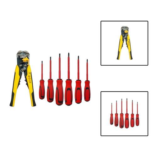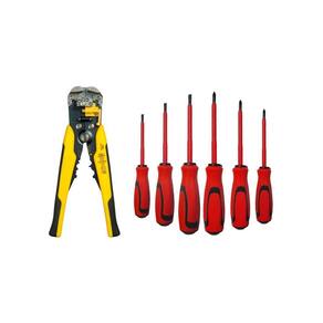Especificações: - Marca: Bomvink; - Modelos: 1702 e 3110; - Quantidade de Ferramentas: 1 Alicate Crimpador Decapador e 6 Chaves Isoladas 3 Philips e 3 Fendas ; - Chaves com design ergonômico e cabos antiderrapantes que oferecem maior conforto e firmeza durante o uso; - Cada chave possui isolamento elétrico, garantindo segurança em trabalhos com eletricidade; - Capacidade de decapagem do alicate: Para fios com bitola até 6mm; - Capacidade para crimpagem: Terminais sem isolamento de 0,5 - 6,0mm / terminais com isolamento de 0,5 - 2.5mm; - O alicate possui várias configurações para diferentes bitolas de fios, permitindo uma decapagem sem danos;