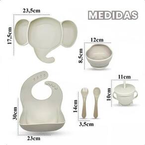 Medidas: Prato de Elefante - 17,5cm x 23,5cm Babador - 23cm x 30cm Talheres - 14cm x 3,5cm Pote - 8,5cm x 12cm Copo - 10cm x 11cm