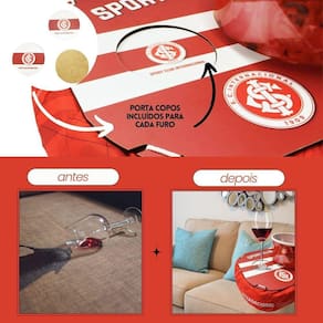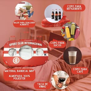 Contém 1 almofada com bandeja, 1 balde pipoca e 2 copos com canudo