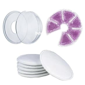 Kit de amamentação Buba feito para auxiliar as mamães durante seu período de amamentação. Conta com uma compressão térmica, um absorvente de seios e uma concha protetora.