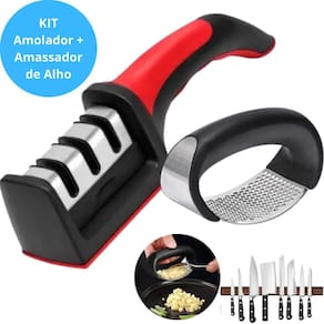 Kit composto por espremedor de alho e amolador de facas e tesouras. O espremedor tritura alho, pimentas, castanhas e gengibre. O amolador é ideal para facas e tesouras. Ambos são feitos de aço inoxidável e ABS, com design elegante e ergonômico. Fácil de limpar e usar.Desmontável
