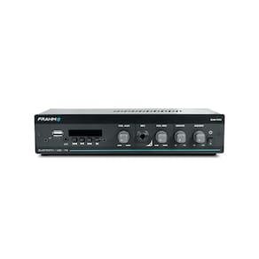 • Item 1: Amplificador Frahm Slim 1600 G5 Bluetooth 60W Preto; • Marca: Frahm; • Modelo: Slim 1600 G5; • Potência: 2x 30W (60W RMS); • Amplificador Mono: Classe AB; • Canal 1: USB, SD Card e FM, controle remoto com troca de pastas / Auxiliar – iPhone, iPod, CD, DVD, TV, computador; • Canal 2: Microfone; • Conexões: Bluetooth, USB, MicroSD, Conexão P2 Auxiliar; • Número de Vias: 2; • Equalizador: 2 vias (graves e agudos); • Frequência de Atuação: Graves - 90Hz, Agudos - 10kHz; • Sensibilidade do MIC: 18mV; • Sensibilidade do AUX: 350mV; • Controle Remoto: Sim; • Consumo Máximo: 85W; • Alimentação: Bivolt Automático (90-240V); • Dimensões do Produto: 5,8 x 27,6 x 12,3 cm.