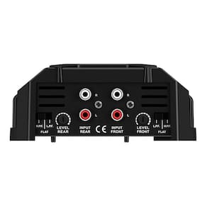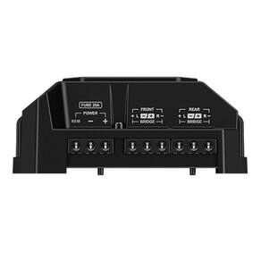 Especificação Técnica: • Número de Canais: 4 • Potência @ 13,8V @ 2 W Stereo: 4 x 100 WRMS • Potência @ 13,8V @ 4 W Bridge: 2 x 200 WRMS • Impedância Mín. de Saída Stereo: 2 Ohms • Impedância Mín. de Saída Bridge: 4 Ohms • Impedância de Entrada RCA: 20 Kohms • Sensibil. Mín. de Entrada RCA: 200 mV • Distorção Harmônica Total: > 0,03 % THD • Relação Sinal Ruído: > 90 dB • Resp. / Freq. (-3dB) @ 2 Ohms: 10Hz a 30KHz • Crossover Low Pass Fixo: 90Hz • Crossover High Pass Fixo: 90Hz • Tensão de Alimentação: 9 a 15V • Consumo c/ Sinal Musical: 16 A • Consumo c/ Sinal Senoidal: 32 A • Cabo Power Recomendado: 4mm² • Cabo Speaker Recomendado: 1,5mm²
