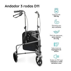 O Andador D11 Dellamed é o único do mundo com 3 rodas, estrutura dobrável e desmontável, unindo leveza e resistência em um só produto. Com peso de apenas 5,86 kg e capacidade para até 100 kg, ele oferece estabilidade, conforto e praticidade no uso e transporte.