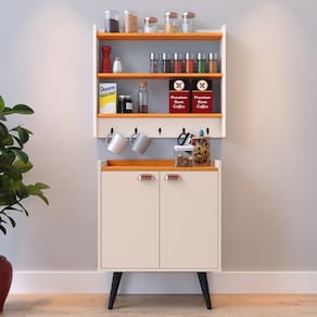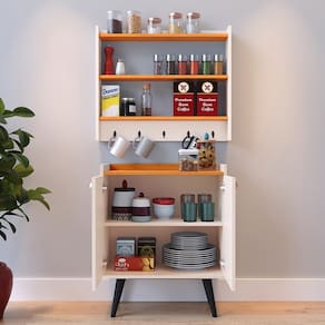 Enquanto isso, o Armário Amélia oferece funcionalidade com suas duas prateleiras perfeitamente adequadas para acomodar condimentos e cinco ganchos que tornam a tarefa de armazenar canecas, panos de prato e outros itens essenciais muito mais conveniente.