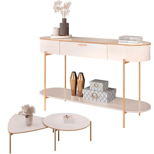 Tenha uma sala de estar completa com esse conjunto Aparador Para Sala Beca com 02 Mesas de Centro Ellie Trina D05 Off White, da Lyam Decor.