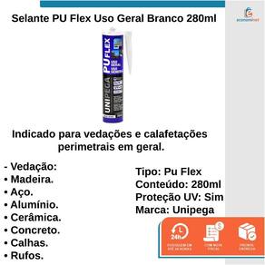 O Selante PU Flex Uso Geral Branco 280ml Unipega é indicado para vedações e calafetações perimetrais em geral. Veda madeira, aço, alumínio, cerâmica, concreto, calhas e rufos.